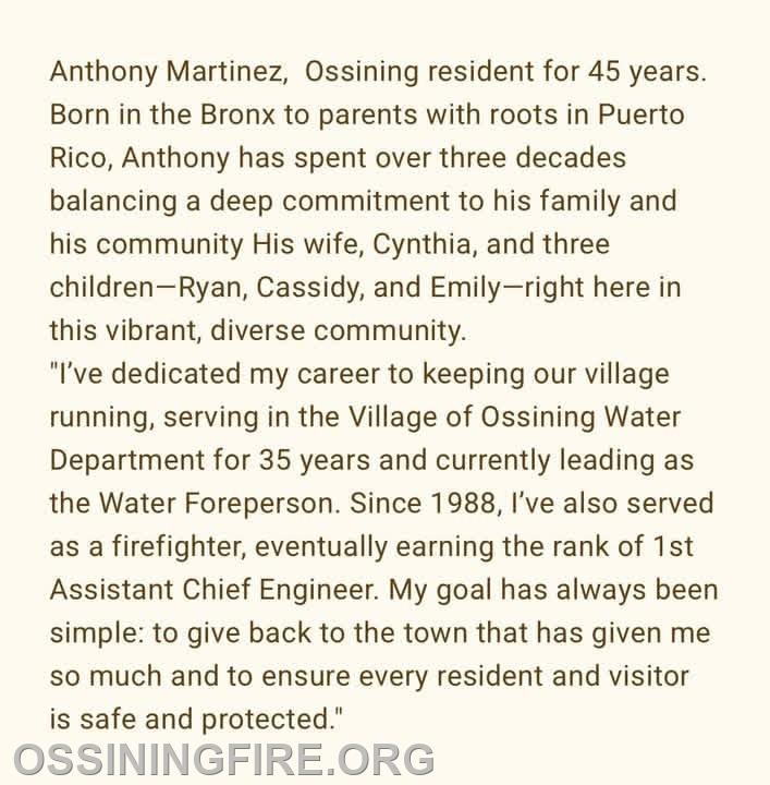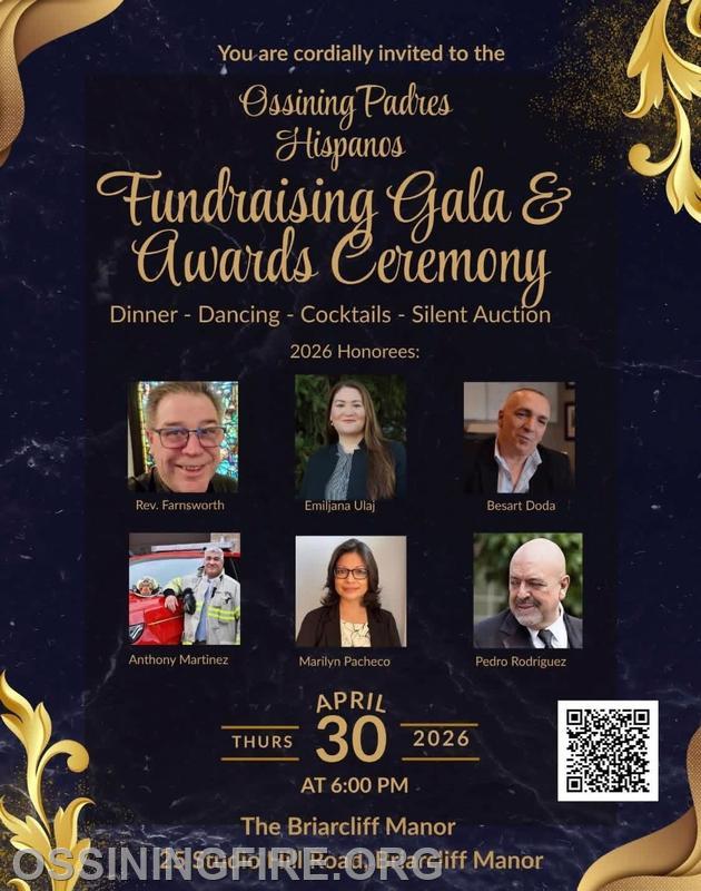 The OFD congratulates Assistant Chief Anthony Martinez on being honored at the upcoming Annual Ossining Padres Hispanos Inc. Fundraising Gala & Awards Ceremony. Chief Martinez is being honored for his dedication to our community as a OFD Volunteer since 1989 becoming a Chief in 2023, and an employee currently serving as one of our Water Department Foreman.