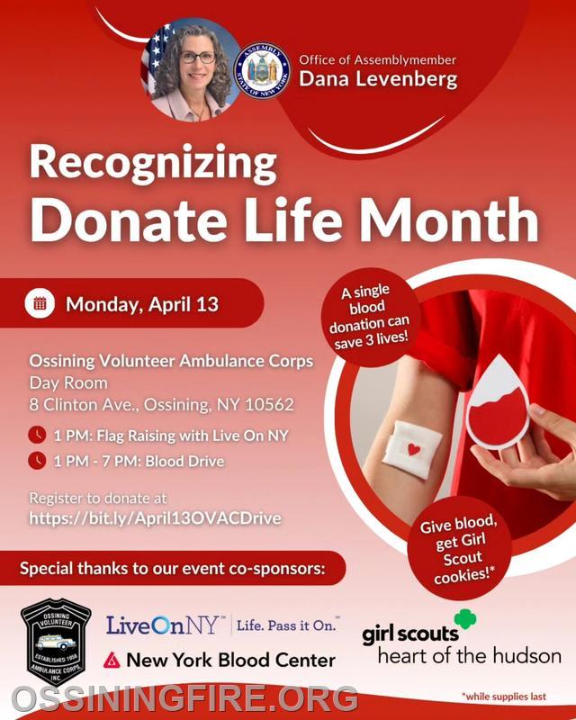 Next Monday, take part in the Recognizing Donate Life Month Blood Drive at the Ossining Volunteer Ambulance Corps.